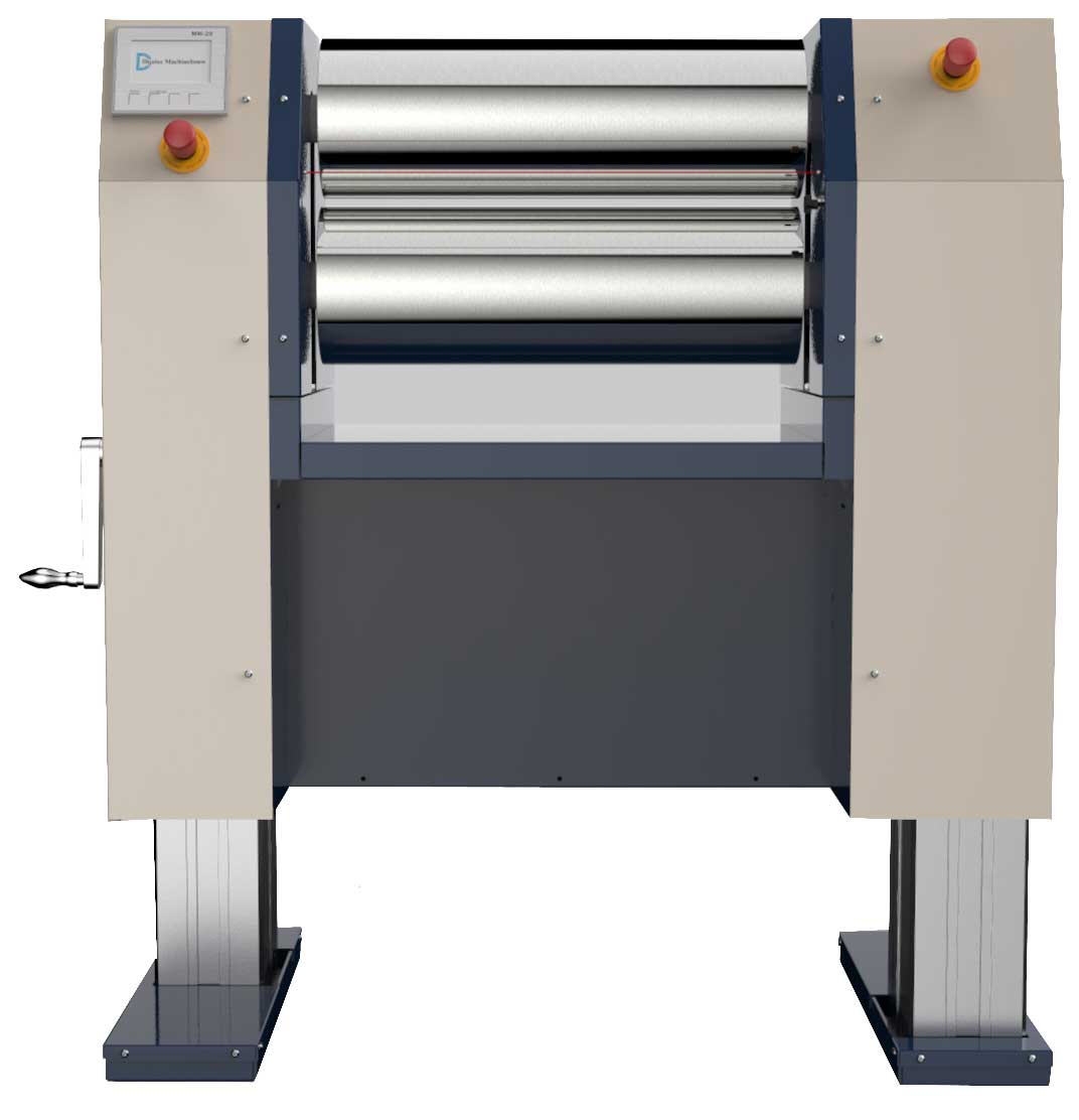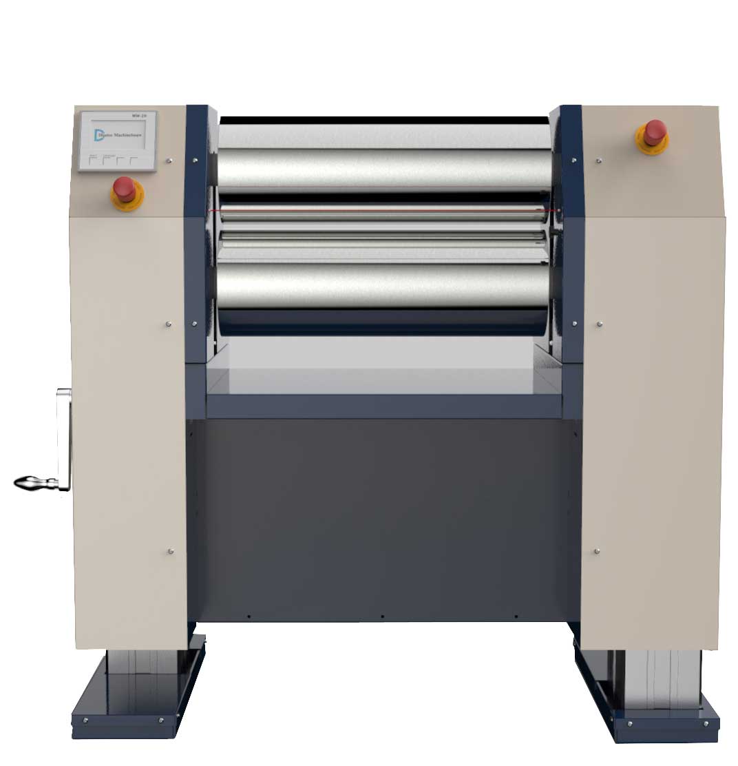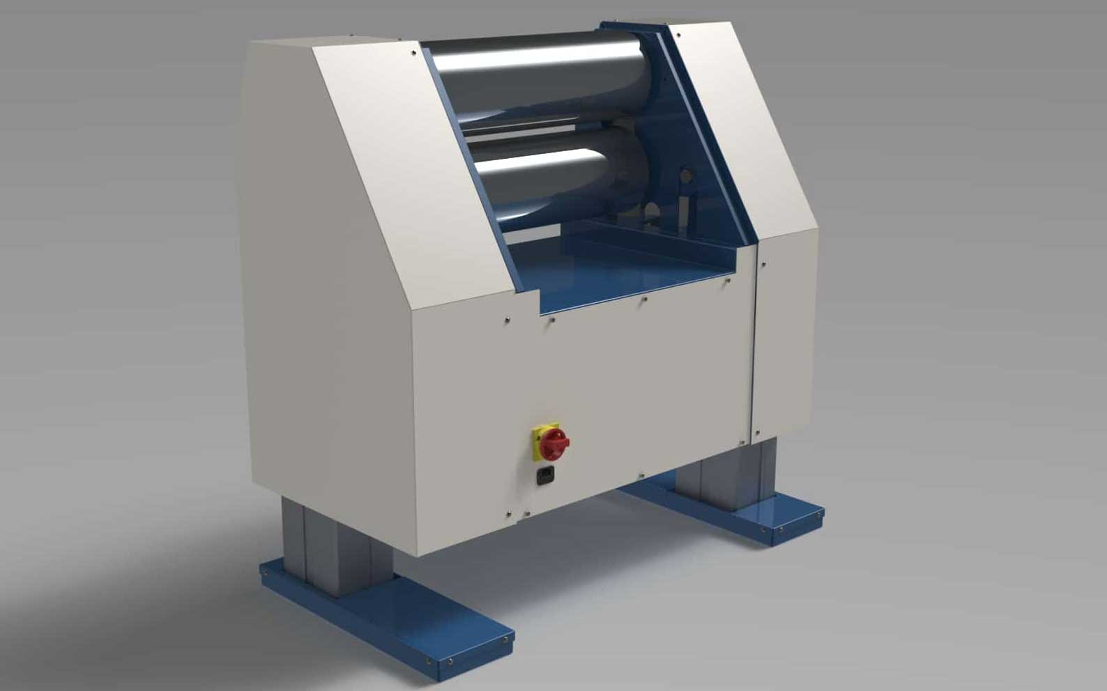 For the mixing of HCR, silicones etc. All ductile polymers that cannot be mixed in a mixer may be mixed in this two roll mill. This big machine is capable of mixing up to 1.25 kg of material depending on the hardness. This machine has been developed to be able to work both standing or sitting. This machine offers the option of mixing large quantities of material in a standing position as well as colouring small amounts of material when sitting. The large space under the bottom roll offers a wide degree of freedom to the operator around the mixing rolls. This machine will be delivered with a desired safety device. All controls are 'hold to run'.
